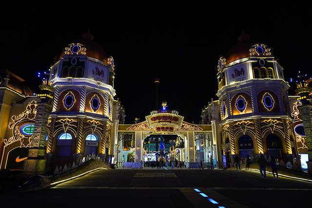 从恐龙园出来不要着急离开,可以来到迪诺水镇看一看夜景,看一看东经120度。这里同样是以恐龙为主题的商业街区,这里集合了购物主题餐饮,创业零售体验游乐度假酒店于一体。这里富有童话色彩,又充满梦幻创意。