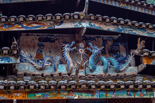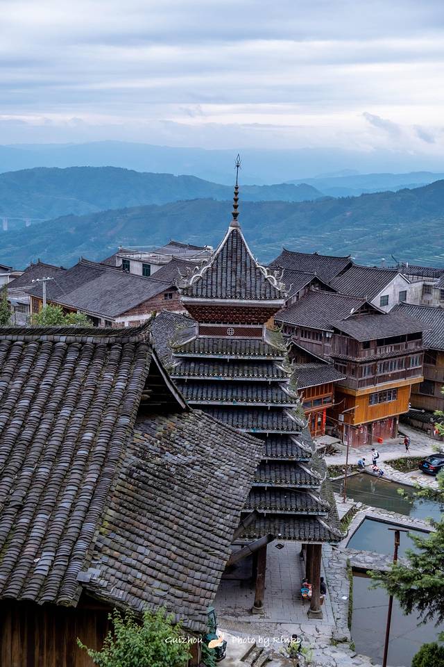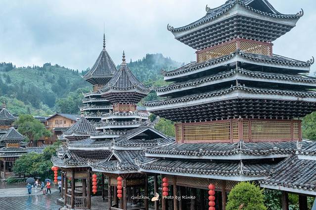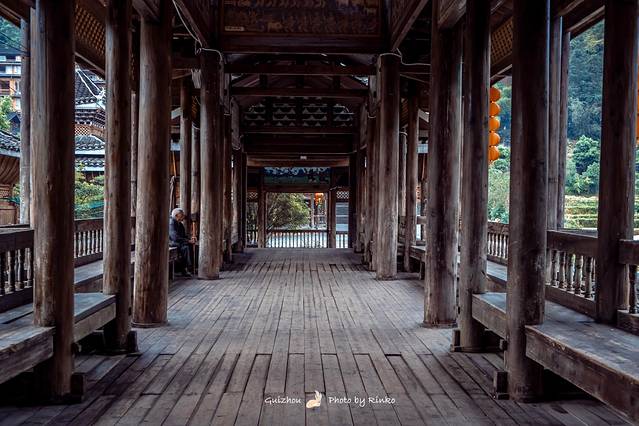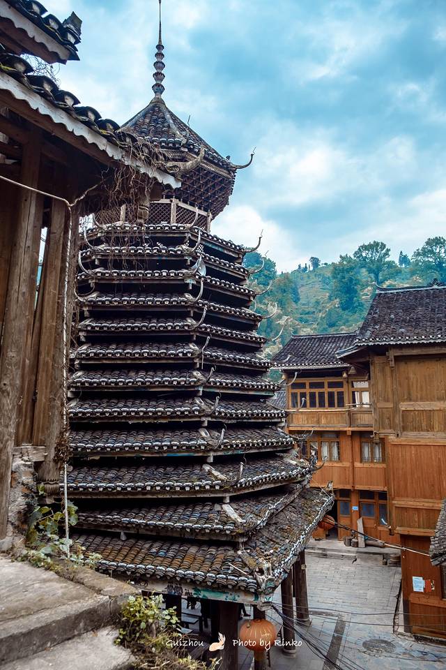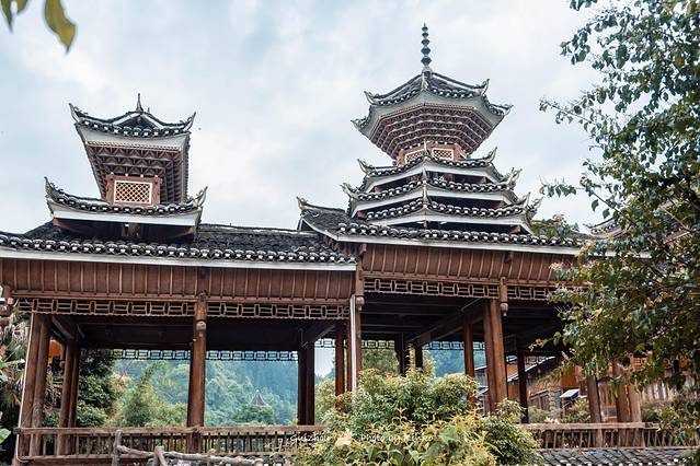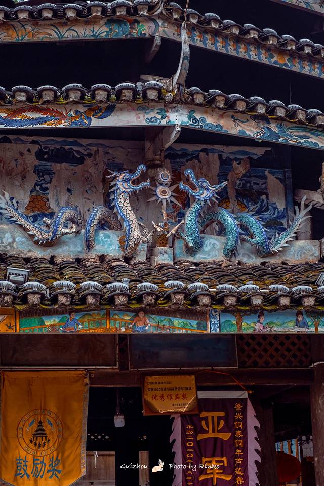 侗寨的建筑的典型特点不外乎:吊脚楼、鼓楼、风雨桥。肇兴侗寨一共有五座鼓楼,代表五个团,分别叫作“仁、义、礼、智、信“。虽然外观各有差异,但都蔚为壮观,载入过吉尼斯纪录。鼓楼对于建筑学上的意义非凡,不用一钉一铆,以木榫穿插而成,五座鼓楼以智寨鼓楼最为精美,鼓楼的雕塑以龙、凤凰、鹤居多,立于檐角或楼顶处,寓意着吉祥平安。16根木柱构成骨架,中间有火塘,四周是供人休憩的长条木凳。鼓楼并非是一个集会之地,而是承担着社交、风俗、宗教等方面的精神场所。侗寨所处的地区多为山地,道路都是上下起伏的,鼓楼前的坪地也是侗族人最喜欢的生活空间,坐下来抽口烟,聊聊琐事,话话家常。鼓楼庇护着侗族人的一生,见证着一代代人的新生和逝去。
