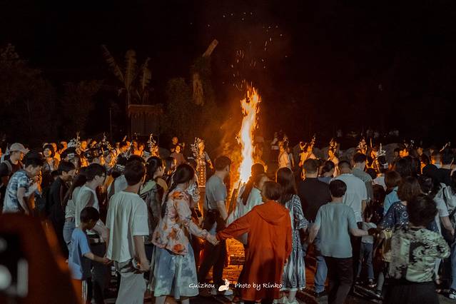我们在第二晚就参加了一个传统游玩项目——篝火晚会,提前购票,晚饭下肚就往寨门口附近的表演场去,仿佛回到了小时候去看灯会的场景。