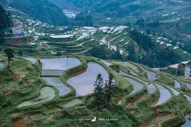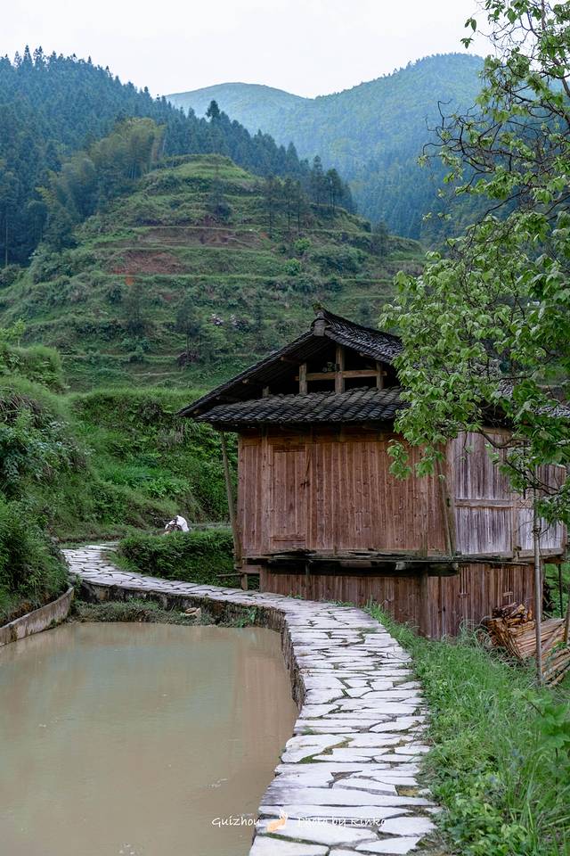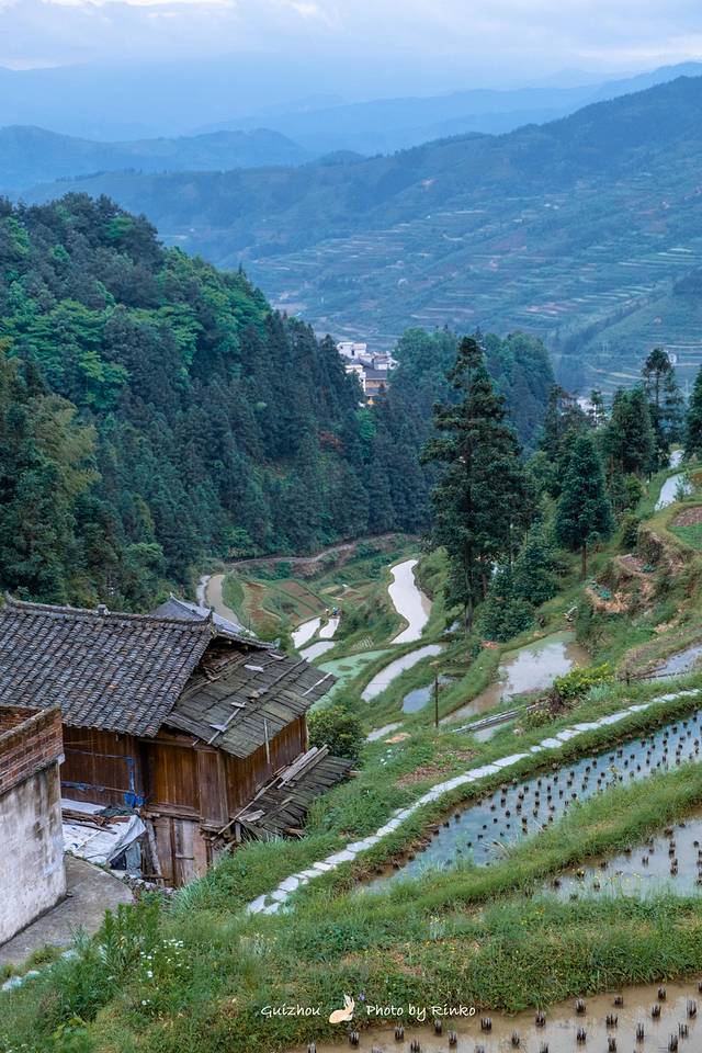 堂安侗寨的后山,有一条石板路直通山顶,步道沿着梯田修建,不同于广西龙脊梯田的机器挖掘,这里的梯田是世代手工耕种而出,拾级而上,蓦然回首,田与山尽在脚下。眺望远山,边缘曲线的优美弧度绵延不绝,沿着大山的褶皱起伏波动,似乎望不到尽头。