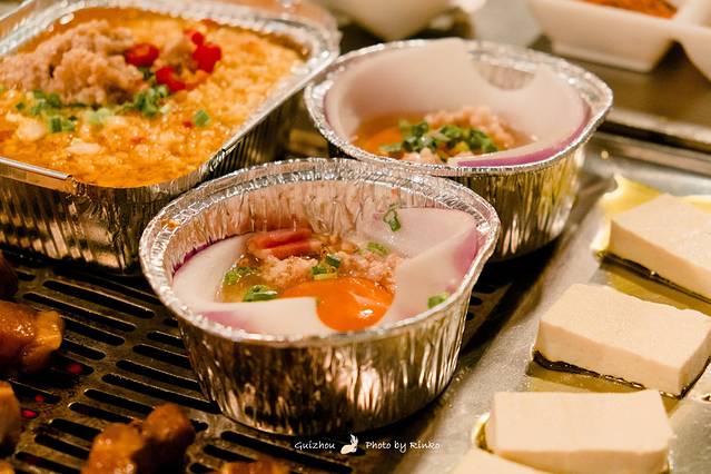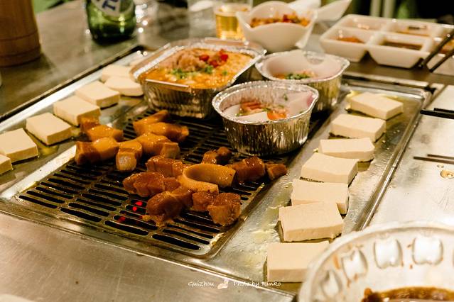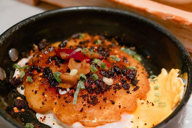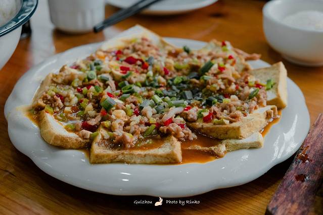 我们还借此吃到了不少之前错过的贵阳名小吃:蛋煎洋芋粑,也就是煎的土豆饼,卖相可人,一看就非常有食欲,味道自是没问题,对得起它的颜值。雷家豆腐圆子,切开一个小口,放入佐料,外脆里嫩。炒酸粉,酸辣口味,一定要刚炒出来时就吃,这个时候口感一绝。烤鸡中宝脆脆香香,烤卷皮滋味十足,包饼油条口感层次丰富,软的面皮包着酥脆的油条,加了辣椒香气四溢。啥也不说了,这一顿真是撑到原地肚皮裂开,我们仨也是能点能吃,还都是饱腹感十足的食物,大开大合之下,再一次心甘情愿接受来自碳水的暴击,大喊一声:贵阳YYDS!