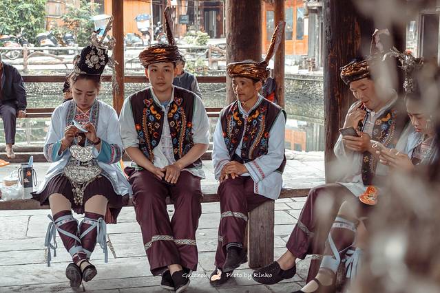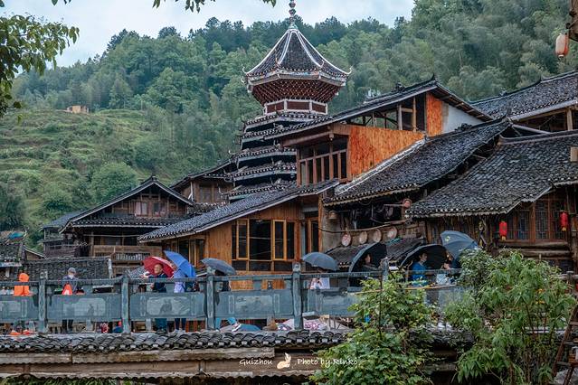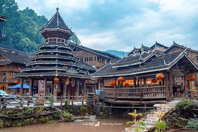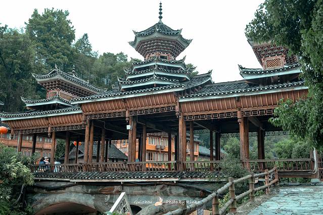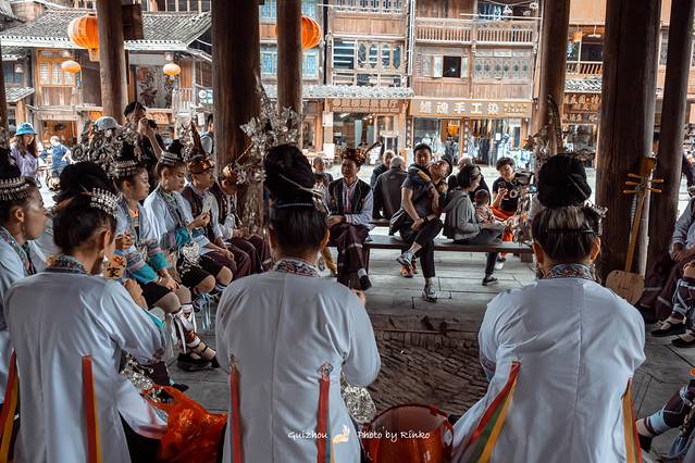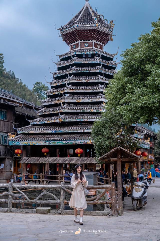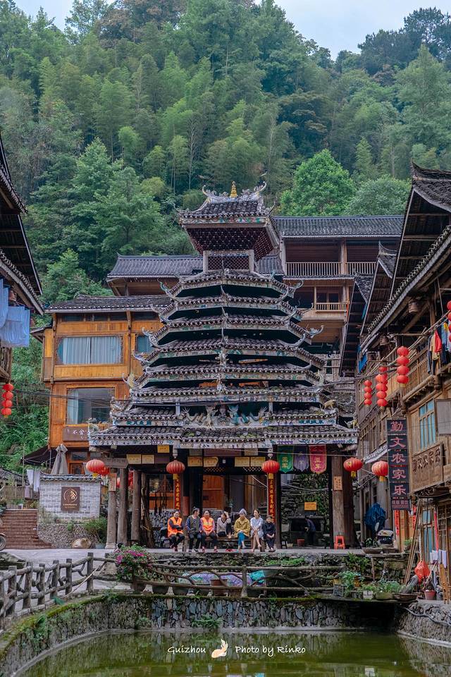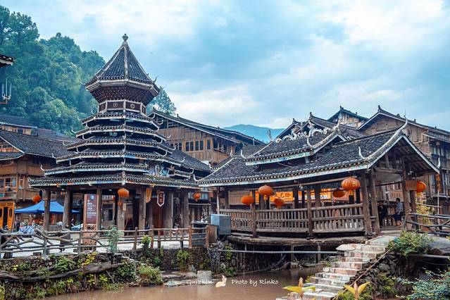 义团鼓楼,位于河边桥头,道路从中穿过,鼓楼的后面是一个精致的戏台,长期作为侗族大歌的表演场地。以仁团为中心的位置,水面开阔,可以看到吊脚楼在河的两侧,风格别致,这几乎是寨中最精华的地段了。信团鼓楼是全寨最高的鼓楼,对面是两处对称的戏台,不少人在这里小憩。礼团鼓楼是五个鼓楼中最早的,非常有生活气息。智团鼓楼和花桥景致特别美,清新幽静。智团附近的表演场,每天晚上八点有免费的歌舞表演,更多是面向游客观赏的节目,我们闻声过去,领略一二。