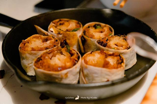 丝娃娃听起来以为是玩具,实则是贵州的一道美食,吃上一顿丝娃娃,才算到过贵阳,把切成细丝的新鲜时蔬和特色佐料包裹进巴掌大的饼皮中,如同小娃娃的襁褓,菜丝中常见如土豆丝、萝卜丝、海带丝、黄瓜丝、笋丝等一水的素食,以及让我望而生畏的折耳根。折耳根在很多人心中就是“甲之蜜糖,乙之砒霜”腥味在口腔中炸裂,即使我是个从小吃惯海鲜的沿海人,也接受无能。丰俭由人,但一定要记得加上脆黄豆,是酥脆的期待。