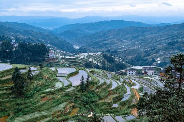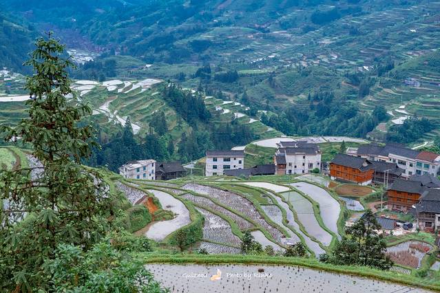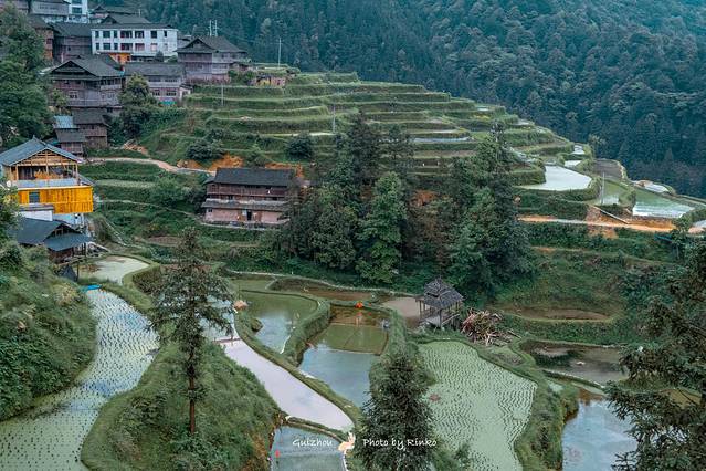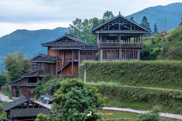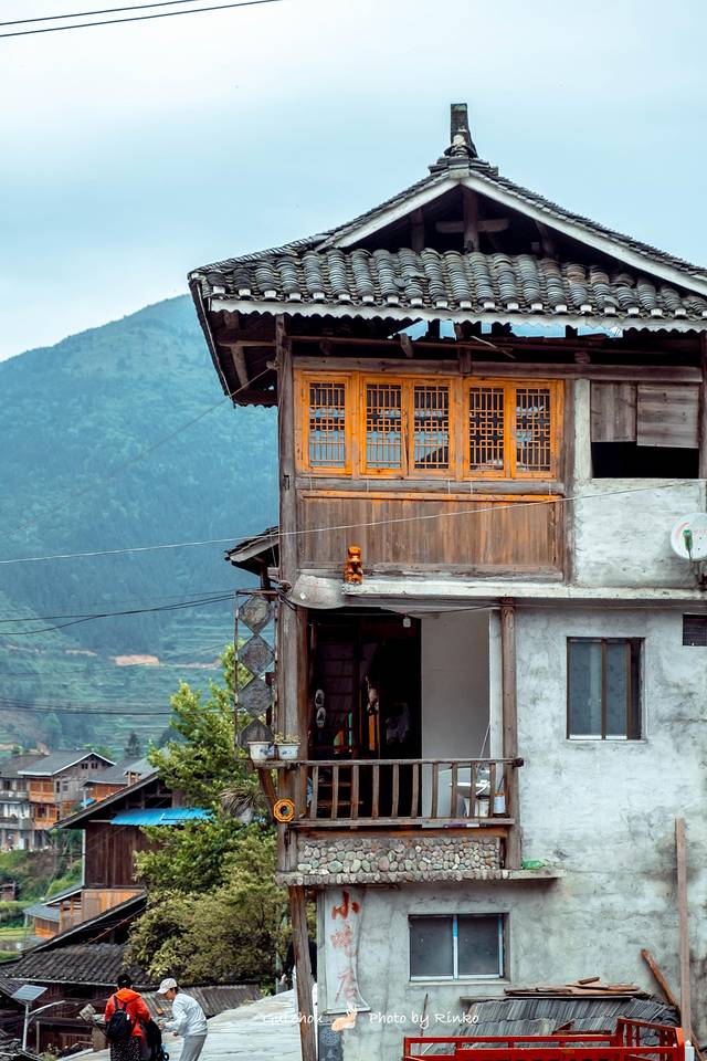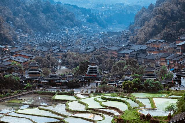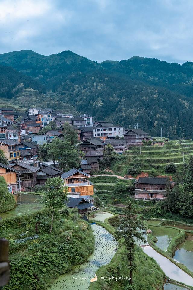 肇兴侗寨是黔东南最大的侗寨,也是商业化气息比较重的,但是第一次来贵州的我并不排斥这类度假型的景区,观光车会把每一个游客送到他们预定的酒店,沿途见识到这里的初印象:大门外就是招牌式的景致,五个大小不一的花桥桥亭前是一片梯田,爬上对面的观景台上能看得到更好的构图,所以我暗暗记下一定要晚上和白天各来一次。