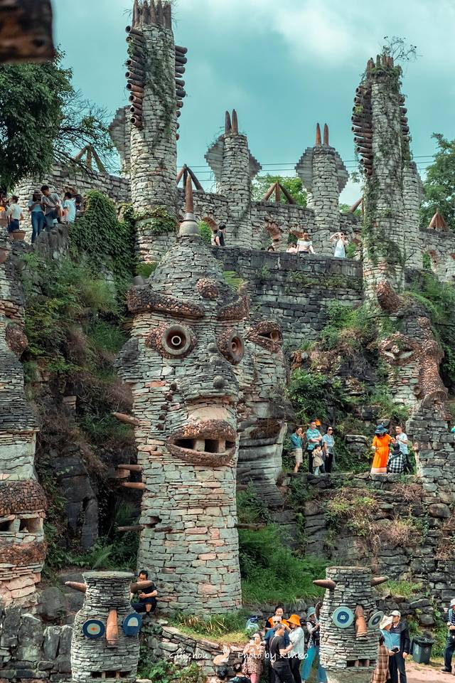 古堡城墙被绿色藤蔓所缠绕,仿佛闯入了失落的古老文明,如果不是源源不断的游客,会真以为闯入了一个奇思妙想的异域世界,整个古堡都是由石头堆砌而成,各种材料被当作石头巨人的五官,每个巨人各有不同,有的狰狞,有的诡谲,有的呆萌,有的诙谐,误以为闯入某一未知的神秘部落,怪诞又有趣。
