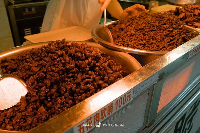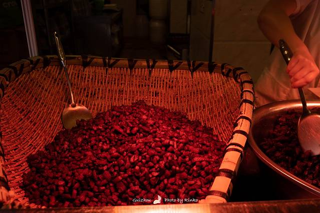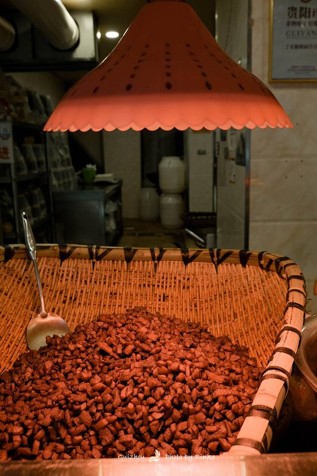 脆哨在我们吃糯米饭的时候就已经留下了绝佳的印象,原料是猪肉,小肉丁包裹诱人的焦糖色外衣,口感类似于猪油渣,据说十公斤肥肉才能产出最后的一公斤成品,最正宗的脆哨用的猪脖子的糟头肉来制作,没有肉腥气,咸鲜之间有的是齿颊留香,成就专属贵阳的美食名片。
