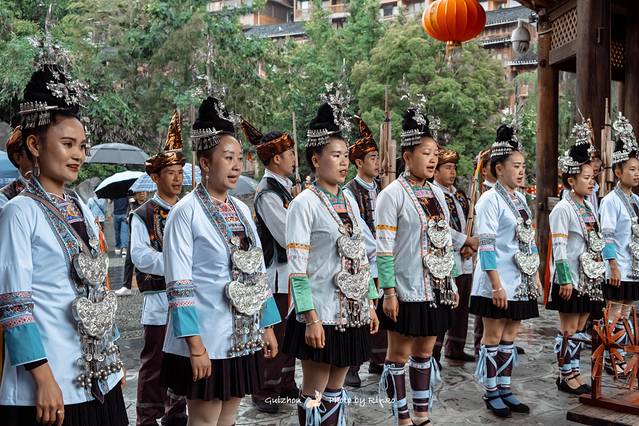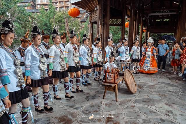 每天早上九点,寨门口就会有拦门酒和竹笙表演。唱歌的青年男女排成一排站在大门迎宾楼下,姑娘唱歌男子吹笙,他们衣着传统侗族服饰,光彩夺目,青春的模样在歌声中闪闪烁烁。