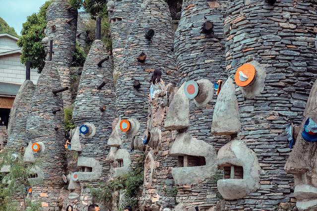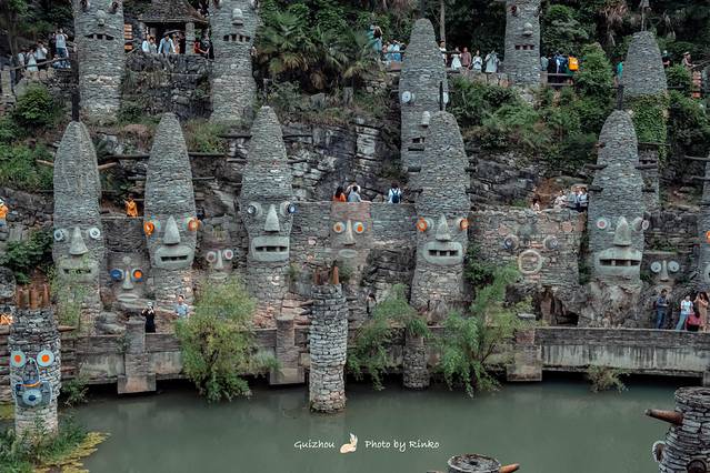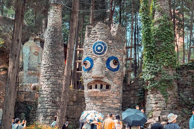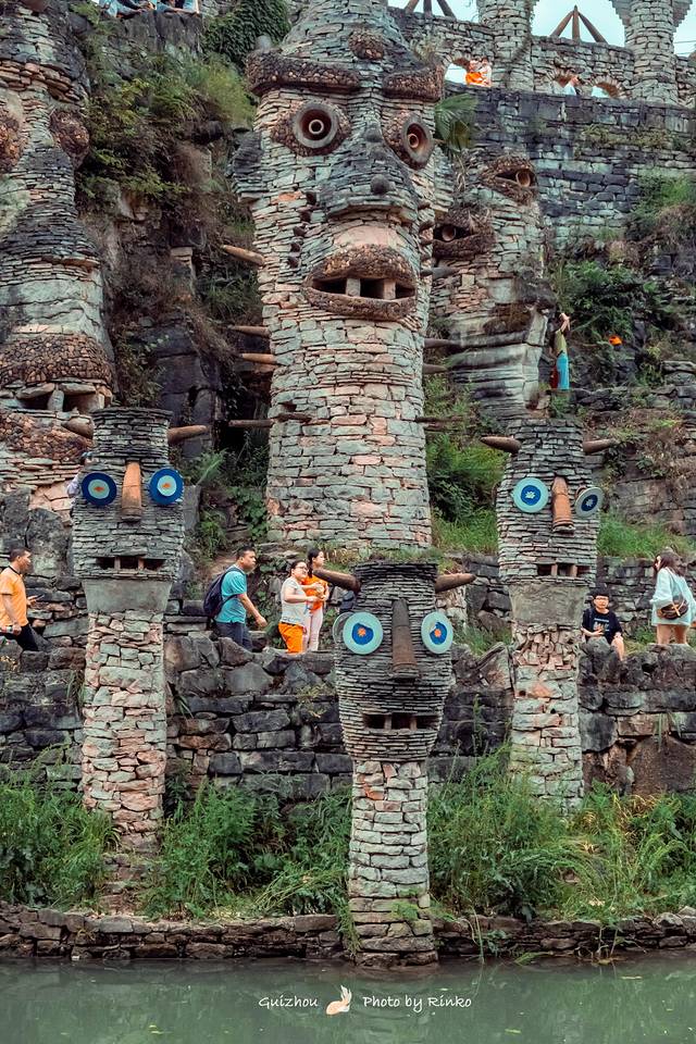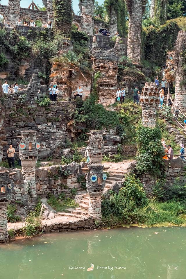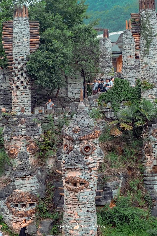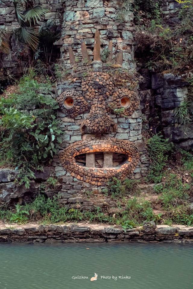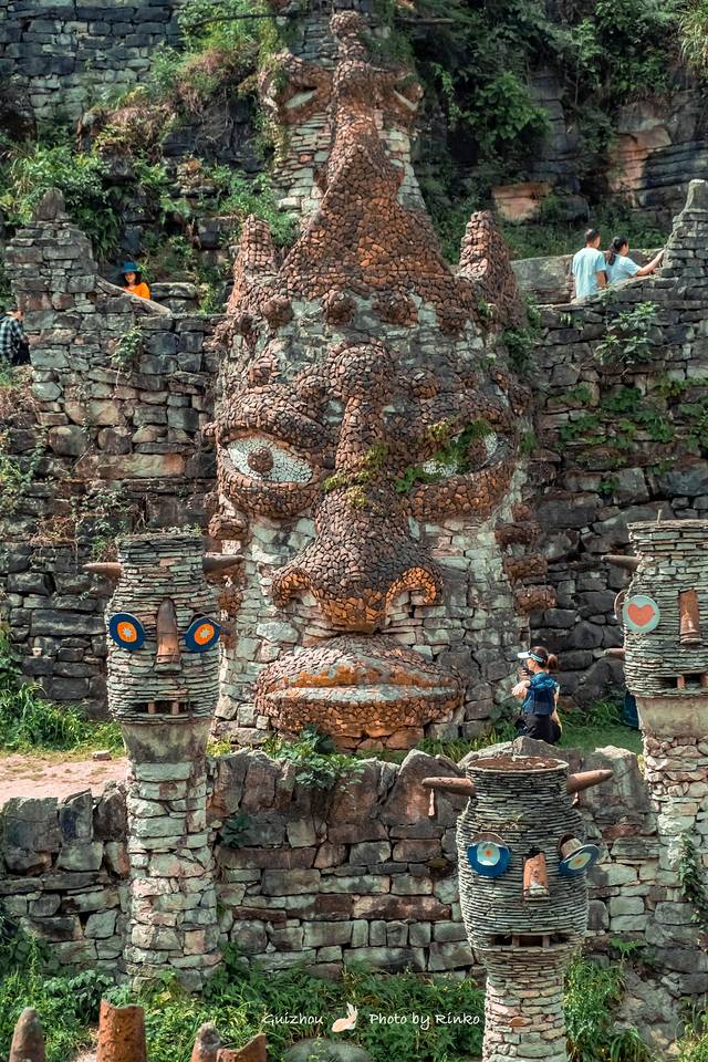 夜郎谷是由宋培伦老先生花了20年时间将自己的奇思妙想创造实现的艺术作品,一座奇迹般的石头王国。最令我钦佩的是其丰富的想象力和专注的创作热情,放弃了高薪的工作和定居美国的机会,与当地村民就地取材,建造一个梦想的乌托邦。出现的一张张石人的脸来源于傩戏中的面具,一种人与自然沟通的载体。