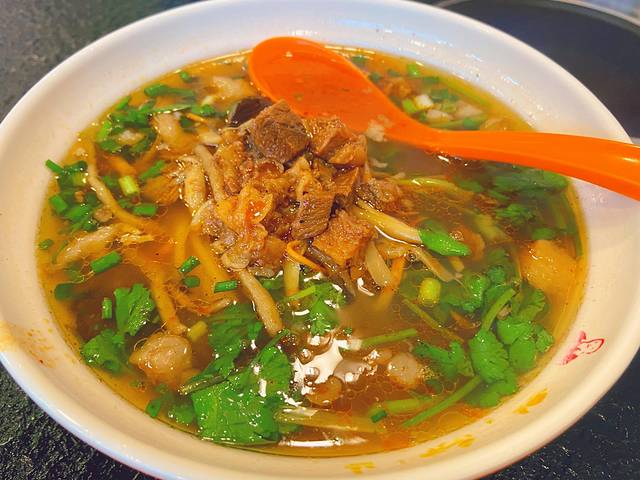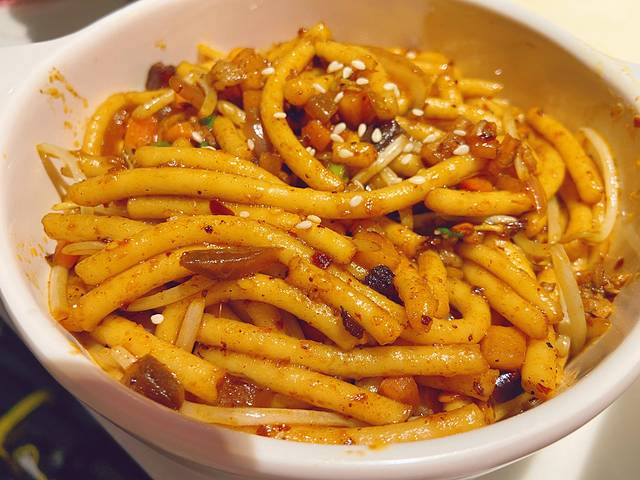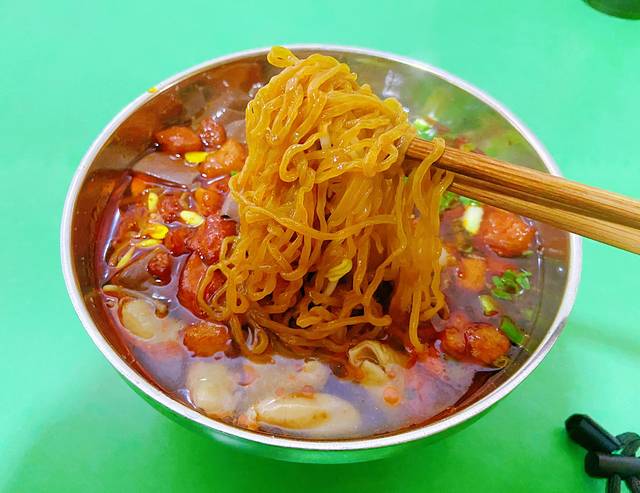 肠旺面我平时吃的面条大有不同,一筷子下去加起来的面条竟是金灿灿的黄色,口感也颇为特别,和面的过程中是不用水的,取而代之的是鸡蛋和鸭蛋,反复按压之下是筋道十足的口感,弯弯曲曲的面条形态也是肠旺面的另一特色,再加之软糯的肥肠加新鲜的猪血,以食之名,成就幸福味蕾交响曲。除了肠旺还可以加入猪脚、脆哨、豆腐等各种浇头。大肠油香四溢,一口下去是Q弹爽滑,猪血形似果冻,红油压轴出场,再嗦一口面条,荡气回肠。这要是出现在中华小当家里,是会发光的美食!