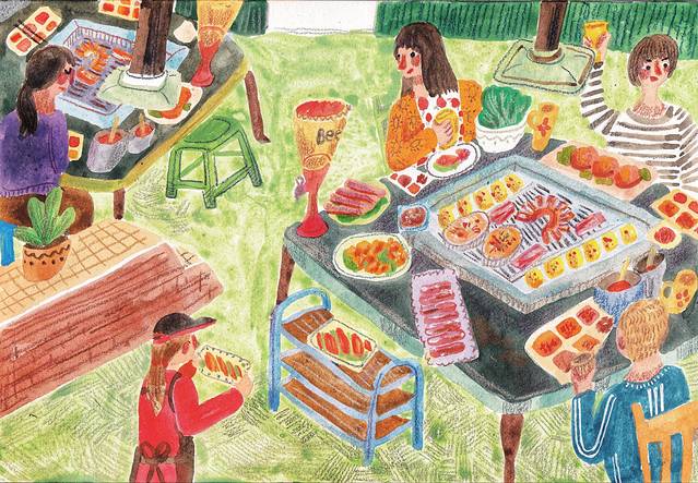 吃法多,蘸料也多,也是开了眼界,牛肉有专属蘸料,五花肉独宠花生洋葱末,配啤酒哥俩好。肥牛薄荷卷每桌必点,相得益彰,清新解腻。香酥坨坨肉肥而不腻,分量十足,可比一般的韩国烤肉,日式烤肉好吃多了。香烤太阳蛋是个人的小爱好,不过得注意前方折耳根高能。