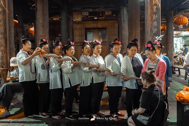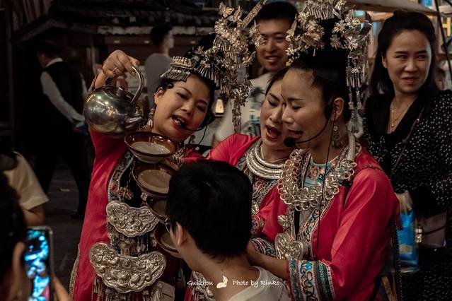 夜幕降临,晚上的侗寨光彩夺目,主街上热闹喧嚣,餐馆店铺鳞次栉比,连户外座位都在游客包圆,很多出来的游客都在体验“高山流水”——在侗族的风俗里,这是最高礼仪,普通四五个人,大型活动时,有一二十人,从低到高依次架起酒壶,像高山流水一样慢慢倒入酒,客人的手不能触碰碗,喝的时候,一边唱着敬酒歌,我也体验了一番,酒是米酒,味道不错,酒精度不高,喝完还会送上一个红鸡蛋。