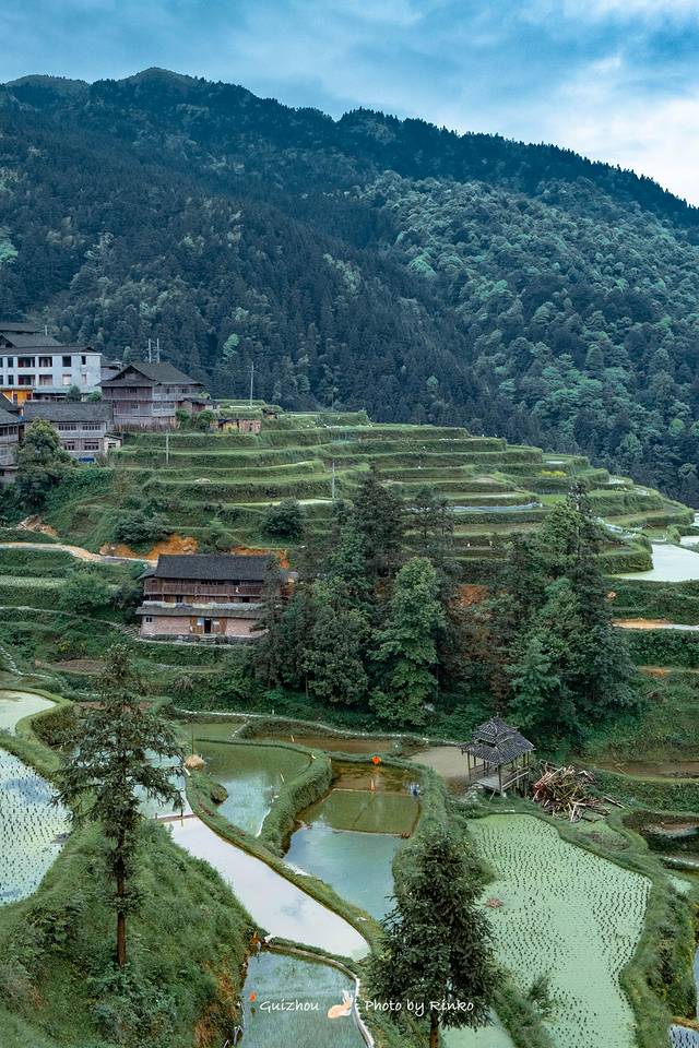 前往堂安侗寨路程并不远,但是一路上层峦叠嶂,不多时就看到了层叠的梯田。浅浅的白雾如同轻纱一般,从山的尽头蜿蜒出来,温柔地缠绕在山腰。木楼的尖顶时隐时现,似是面带羞涩的侗家女孩儿。偶尔能看到几棵杉木的树梢,朦朦胧胧,袅娜地隐在轻纱之下。不多时,薄雾升腾起来,往更高的山顶而去,整个村寨都像是悬着的空中楼阁。村口有一家甜品铺,二楼可以看到梯田的全貌,不过需要在店里消费才能上楼,想着吃个甜品看梯田也是绝佳的享受,探出头看向远方,层层浅浅,虽然没有阳光,也是极美的。当然这和无人机的视角还是有一些差距,不过已经足够。