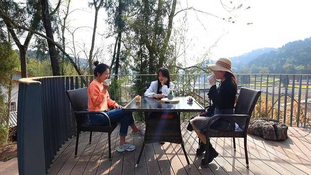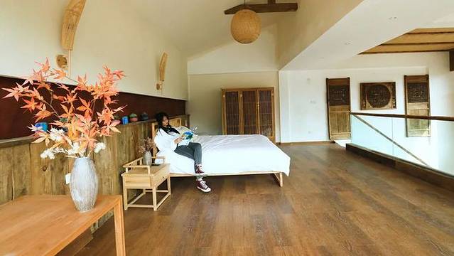 拾阶而上,穿过露台木地板,置身民宿内,陷入温柔的床榻上,望过落地窗,嗅着山水清风,听风问云,不知山中岁月长,飘离了尘世纷扰。
