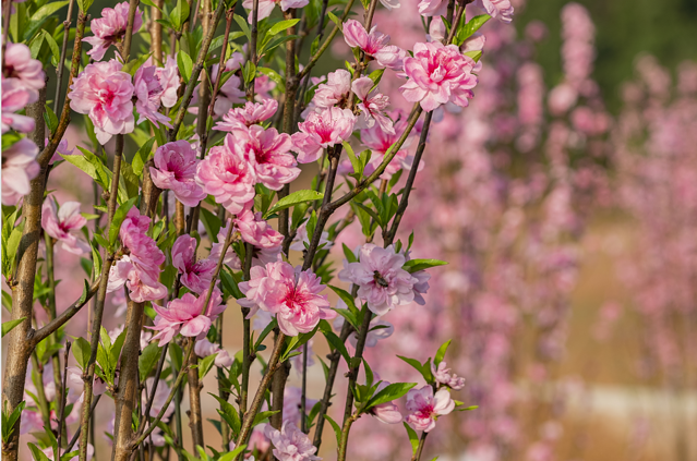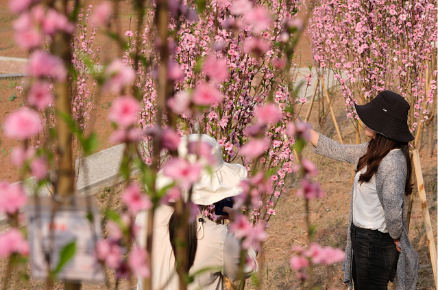 走进桃林,一眼望不尽的桃花朵朵绽放,宛如漂浮着的粉红云霞。看着这片美景,我们也不免柔情起来,与娇柔的桃花合影拍照,让人有种幸福的眩晕感。