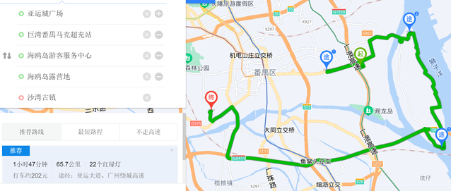 路线:【亚运城广场-临近的超级充电站-海鸥岛-沙湾古镇】