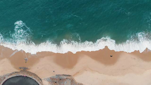南门湾的沙滩和海浪,海水很绿,浪花很白