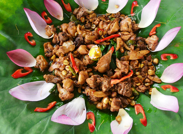 莲子炒鸡,用的是晓镇荷塘里新鲜采摘的天然莲子!