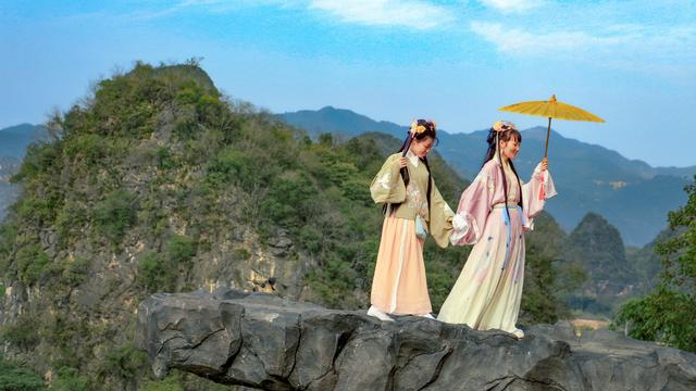 和姐姐一起穿上传统经典的汉服,举起朴素淡雅的油纸伞,走在半空中,