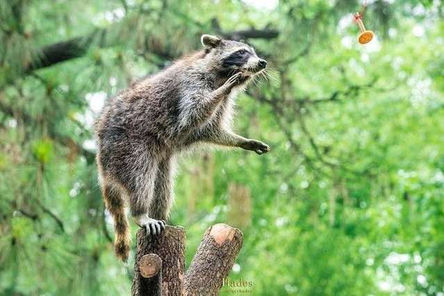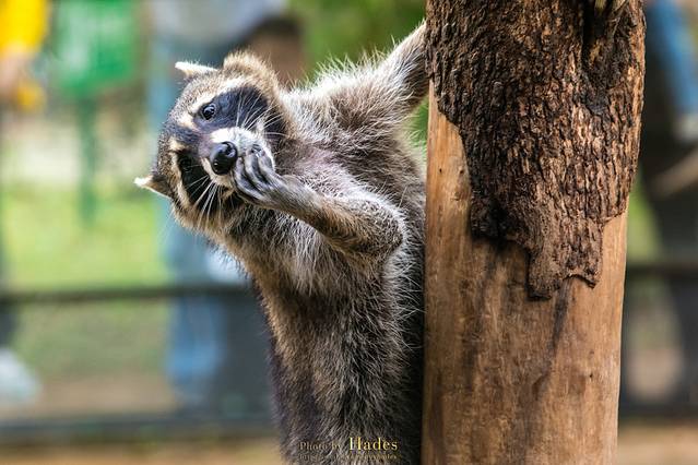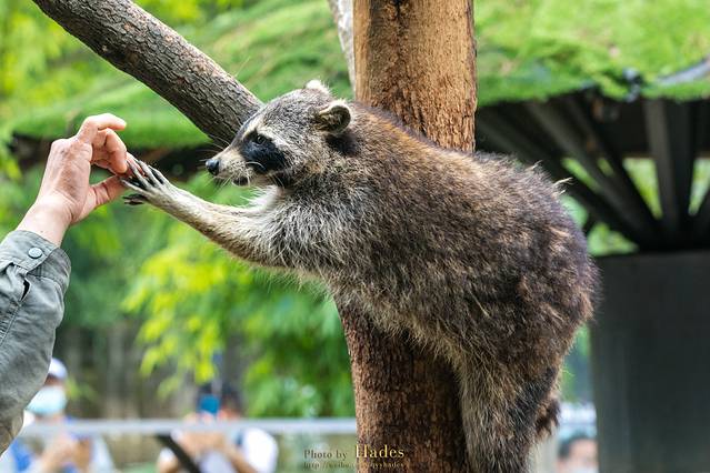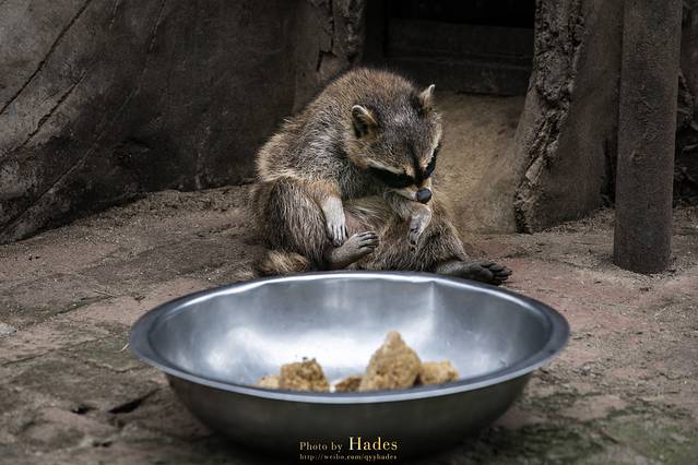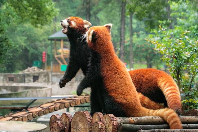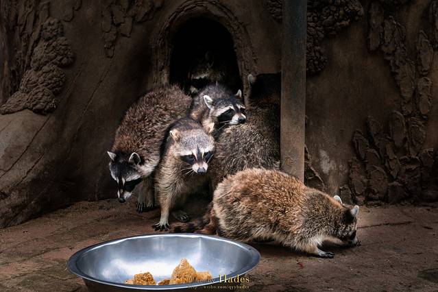 小熊猫的邻居是群探头探脑的小浣熊!虽然它们长的有些像,但是完全没有血缘关系。小时候常吃的小浣熊干脆面,名字叫小浣熊,包装上却印着小熊猫的图片,误导了大家很多年。景区让小熊猫与小浣熊做邻居,让方便面主角合体,也是用心了。