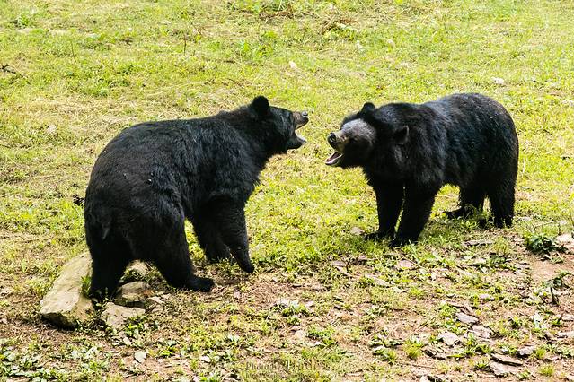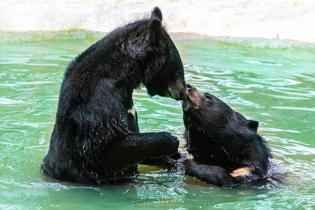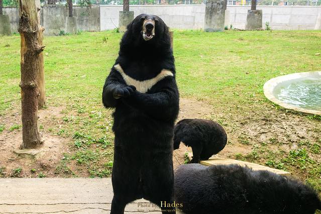 不远处围了很多游客,好多孩子都骑在家长肩头向下探望。这片便是亚洲黑熊的地盘,熊大熊二憨憨的感觉,在这里可以实地领略一下。黑熊们有的在嬉戏打闹,有的在泡澡搓背,更多的黑熊,不是在蹭痒就是在跟游客讨苹果吃。熊之百态,不禁让人怀疑他们都是工作人员套上皮毛假扮的!