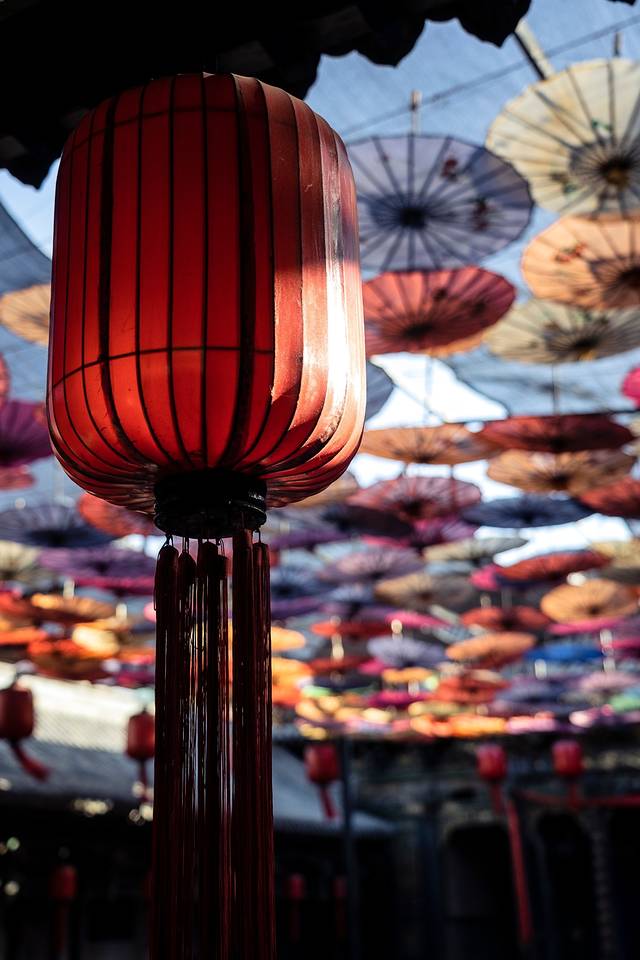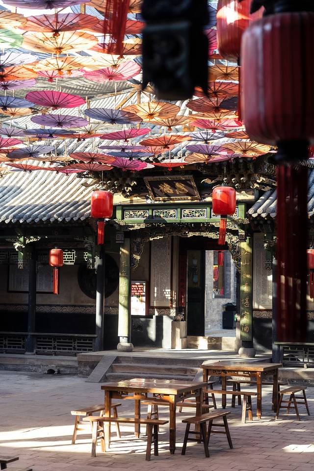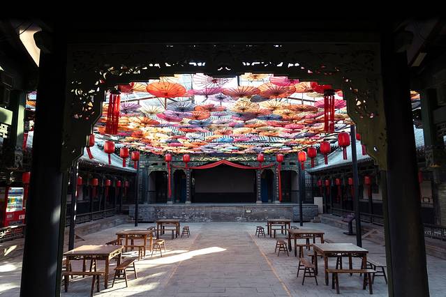 我穿过乔家大院高耸冷峻的深宅高墙,却猛地与大红灯笼与斑驳伞影撞了个满怀。抬头望去,是方精致而空无一人的舞楼,天井上密密麻麻挂满了五彩油伞。