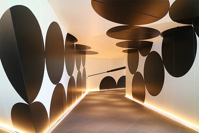 走上二楼,迎面就是大门!结构上看不见大堂前台,给人一种期待感,不知道前面会有什么。仔细看看墙壁设计,灵感居然是来自章鱼小丸子。不愧是大阪!(笑)