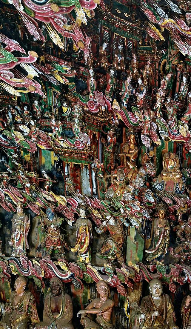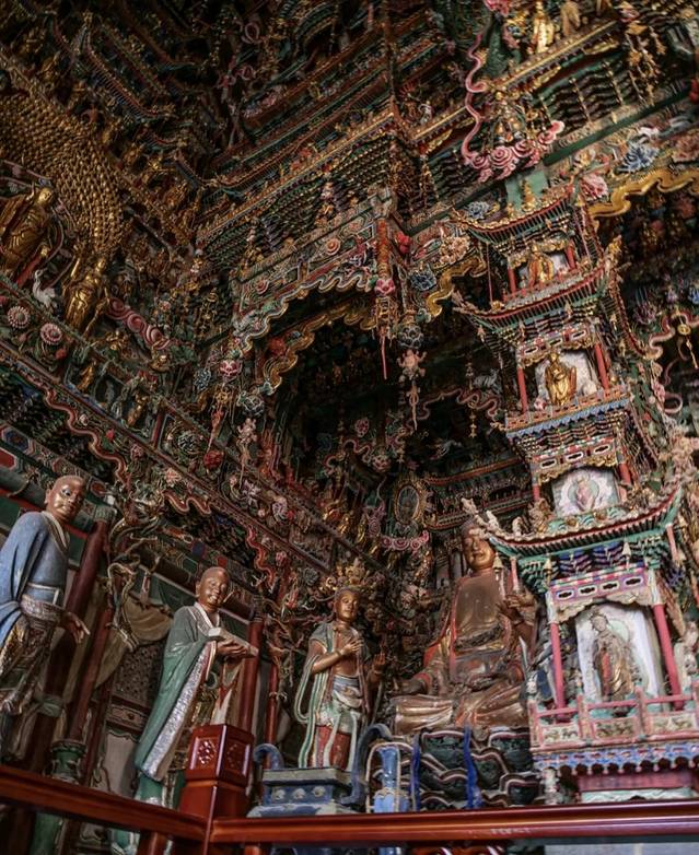 整个殿内的墙壁、梁柱、顶棚上,都悬塑着佛教弟子和故事中的飞禽走兽,造型优美,惟妙惟肖。