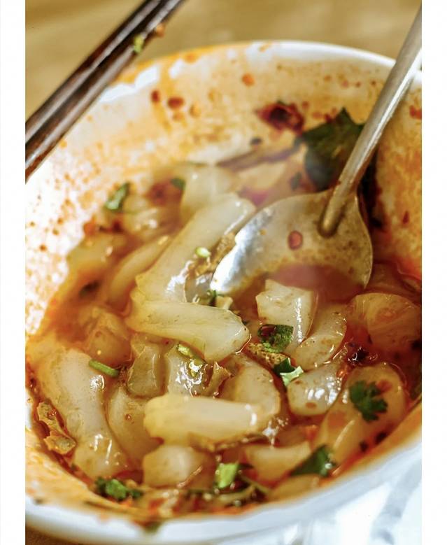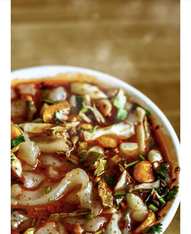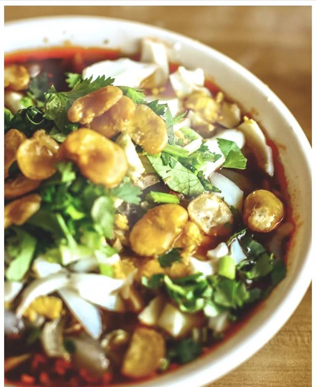 以土豆淀粉原料制作而成,还可以加入当地的特色黑豆腐干、蚕豆、鸡蛋、香菜,对了,还得放点辣椒。