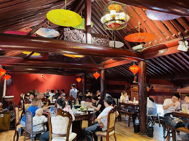 装修是比较明清风格的氛围感还有各种绿植,不管是下午来还是晚上来吃都很有感觉一到饭点特别热闹,暖黄的灯很温馨~