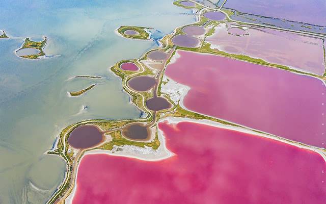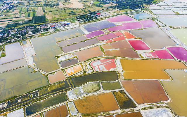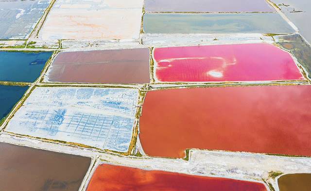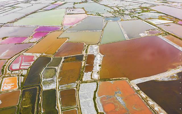 每年6-8月是这里最鲜艳多彩的时候,一块块盐池由于所含藻类不同和密度不同呈现出丰富各异的色彩,远远看很绚丽,非常惊艳