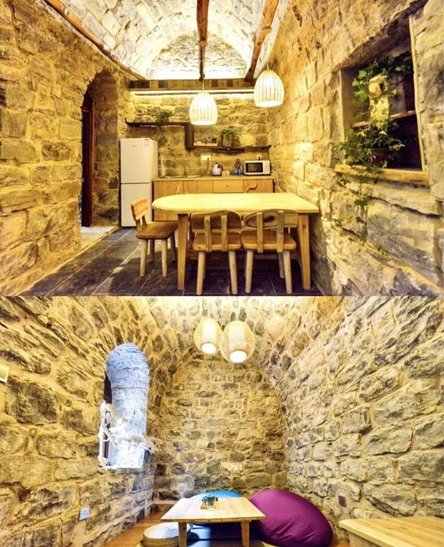 有几套不同的庭院,这次住的是雨顺院,小院里有三间窑洞式房间和一间茶室其中有两间房相通适合两家人一起。