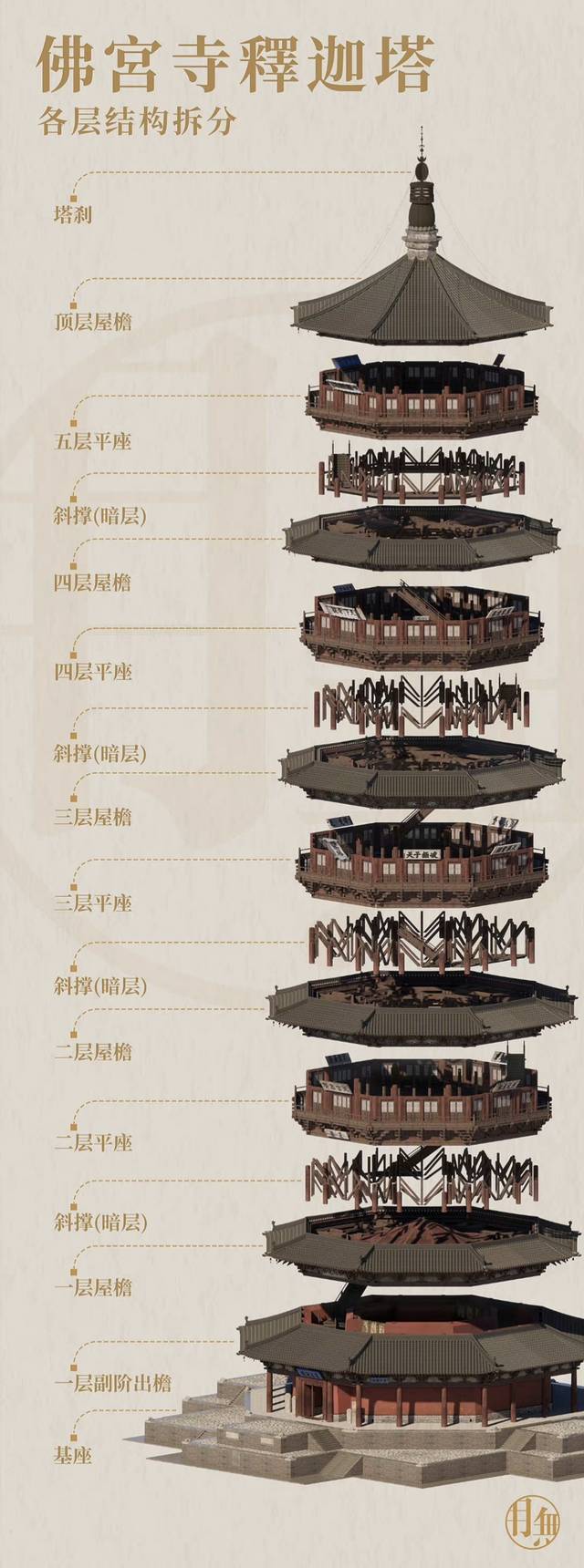 这70种斗拱,480朵,被日本伊东忠太说“这与日本千篇一律、每一层都使用相同斗拱的手法相比,孰优孰劣自不待论。”当我们遗憾唐代木建筑都在日本的时候,中国只需一个应县木塔。
