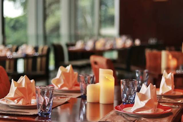 每个桌子都有落地跳高窗户和无敌花园景观。