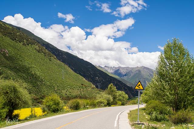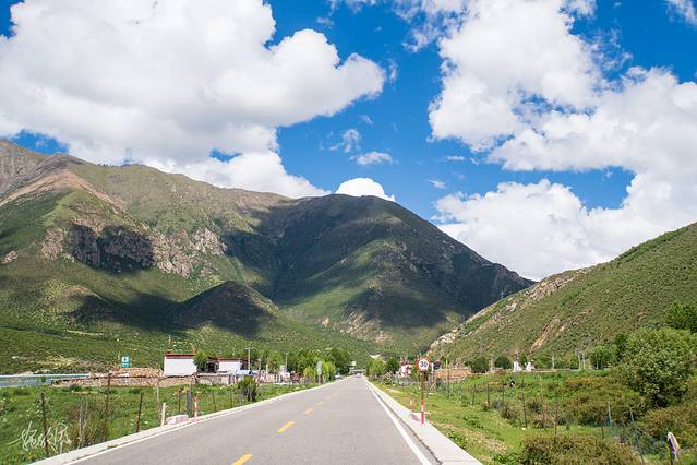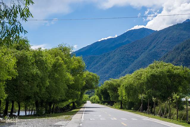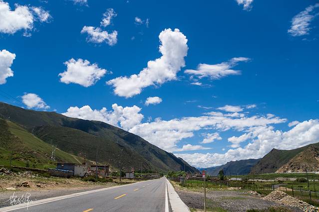 前面20公里埋头苦骑,到了扎西岗村,眼看着天又要下雨了,索性找了家藏餐馆点了碗牛肉面吃。吃完再出来,阳光隐隐约约照在身上,抬头一看前行的路开始出现了蓝天。脱掉冲锋衣,戴上遮阳帽,继续出发。