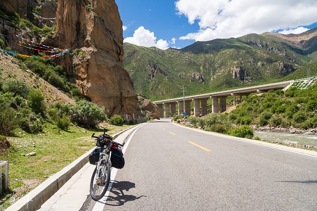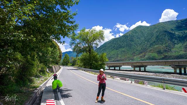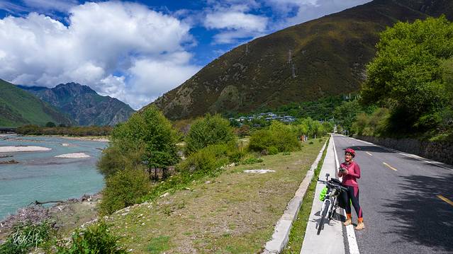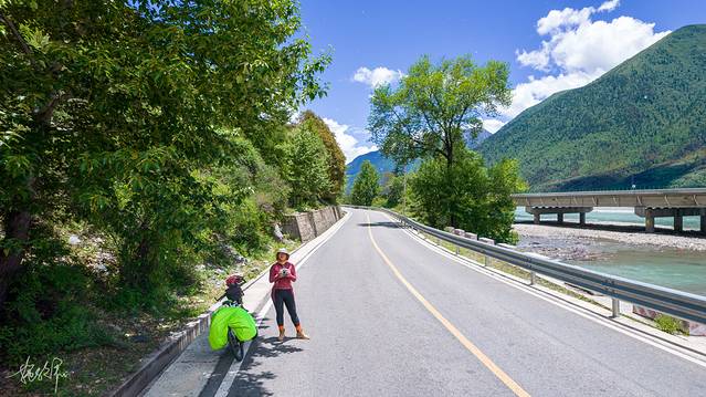 我骑得可慢了,四处张望,好在有GoPro在车子前方,一边录影一边还能记录下我当下的想法。好几次迎面而来的骑友们都被晒到红彤彤的,他们这是一路向西,追着太阳的方向跑。而我是往东边而去,每天睡个小懒觉,磨磨蹭蹭十一二点出发,此时的太阳不是在我的头顶就是在我的后方,我估计一直顺着光骑到芒康区,被晒到的机率大概也就只有翻山越岭之时,有点小开心。