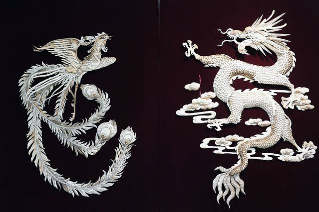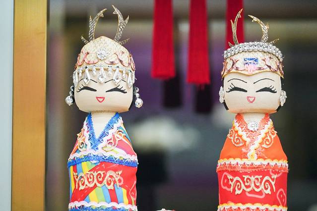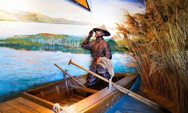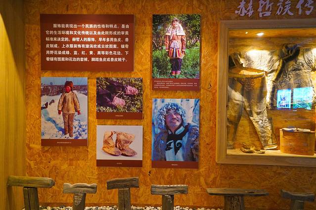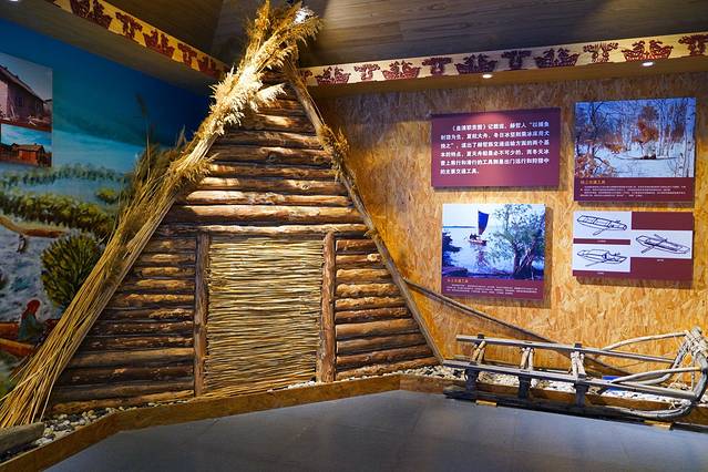 走进赫哲民族文化村的民俗馆,在这里我们可以了解到赫哲族的演变过程。当地人常常坐着形状似饺子的桦皮船。此船用桦树皮粘制而成,两头尖,船体轻便,行船速度很快。民俗馆里还陈列了赫哲族在渔猎时使用的鱼皮火镰袋、撅当钩、伏弩等工具。赫哲族女士的鱼皮裙十分精美,样式繁多,彰显了赫哲族女人心灵手巧。他们在房屋的居住上也极为讲究,赫哲族人以西为尊,讲究长辈住西屋,晚辈住东屋,中央的灶房的西侧墙面供奉着灶神。在民俗馆的最后一部分,展示了赫哲族人精美的图纸剪纸艺术和婚礼的场景。