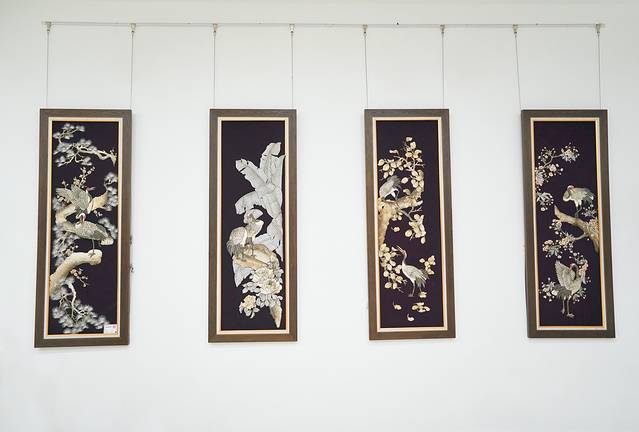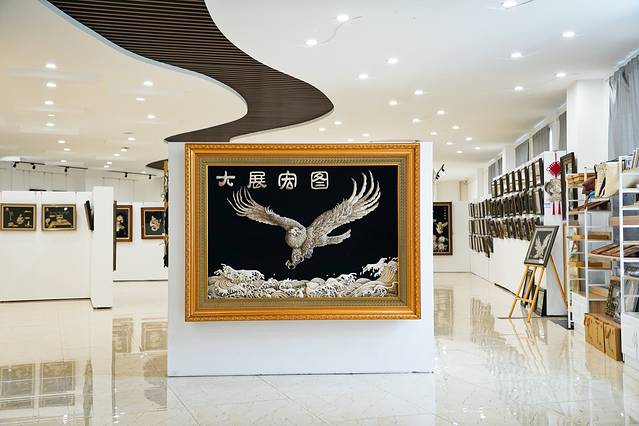 走进展馆,映入眼帘的就是满屋的鱼皮画。从山水风光画,到人文生活画卷,每一幅画都极为精致。鱼皮画上的虫、鱼、鸟兽都显得栩栩如生。赫哲族通过对鱼皮的粘贴和镂刻,以独特的形式,在艺术工作者的帮助下,造就了一幅幅栩栩如生、美轮美奂的鱼皮画。
