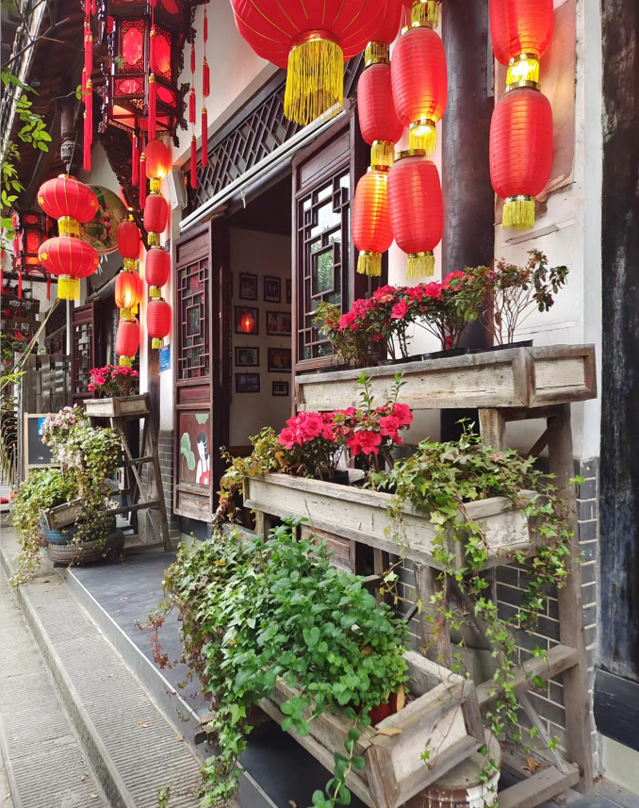 能看见有些店家门口还种植了些花草绿植,也是非常有情调了。
