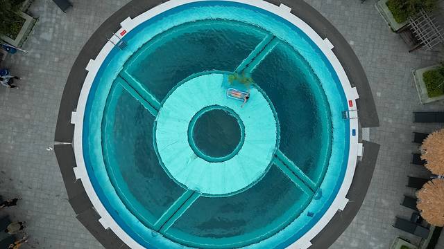 温泉公园最网红的要属顶楼的泳池,圆形的泳池在航拍视角下很唯美,拍照打卡也是一绝。因为是顶楼,换泳衣上去风有些大,会冷,记得带条毛巾。