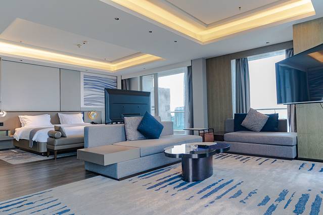 酒店拥有三百余间舒适明亮的客房及套房,均是海景房,可看到美丽的渤海辽东湾。270度的看海的大床房,可尽享明媚海景。