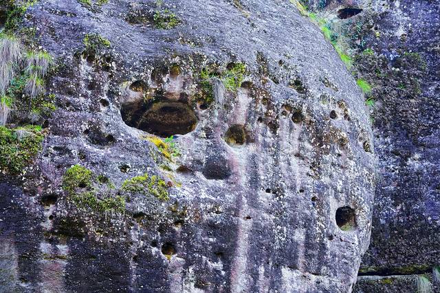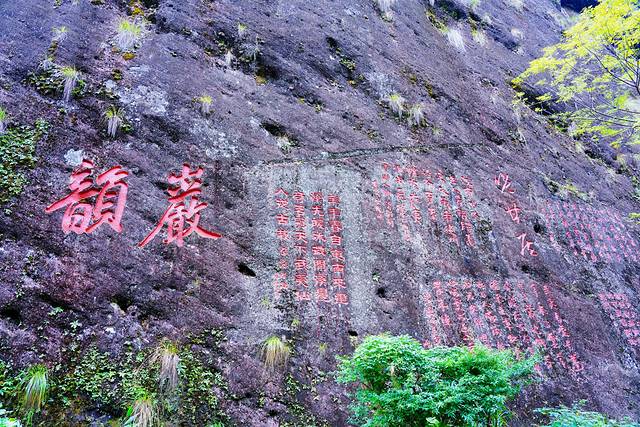 大自然赐予了武夷山独特和优越的自然环境,吸引了历代高人雅士、文臣武将在山中或游览、或隐居、或著述、或授徒,前赴后继,你来我往。文人墨客总喜欢写点什么,于是就留下了众多的摩崖石刻。这块崖壁上就刻满了古人的“涂鸦”。