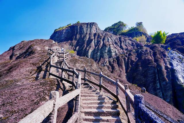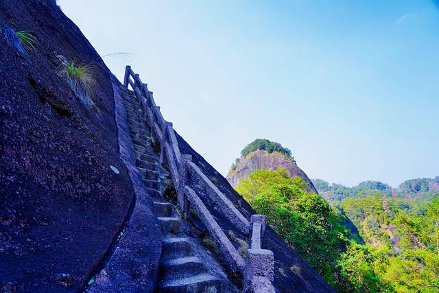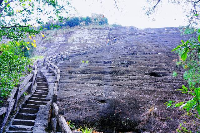 进入虎啸岩景区向前走600米即遇到一个岔路口,直走是一片种植武夷岩茶的坡地,右转是一条登山路,往上看,一座巨大的直插云霄的山峰,岩壁自下而上开凿了“之”字型的石阶,犹如一座天梯,此处即为好汉坡。
