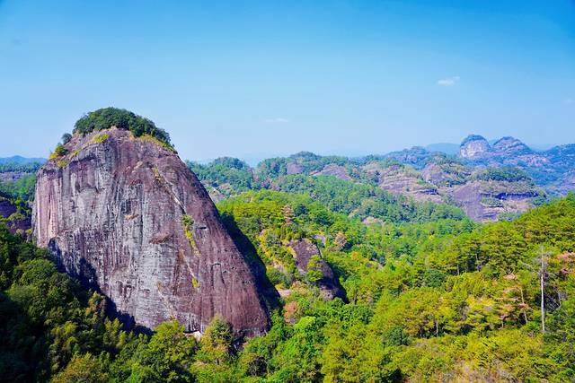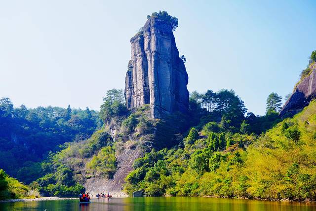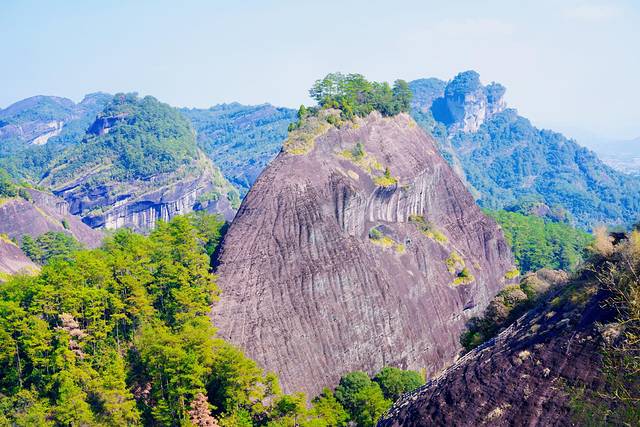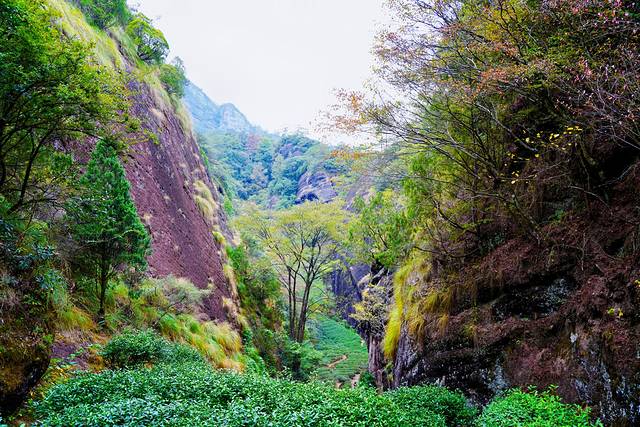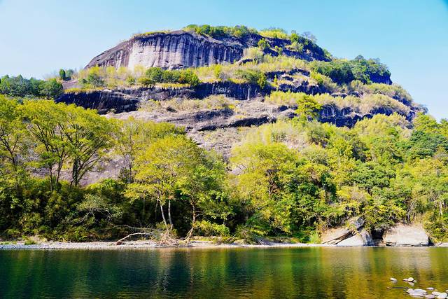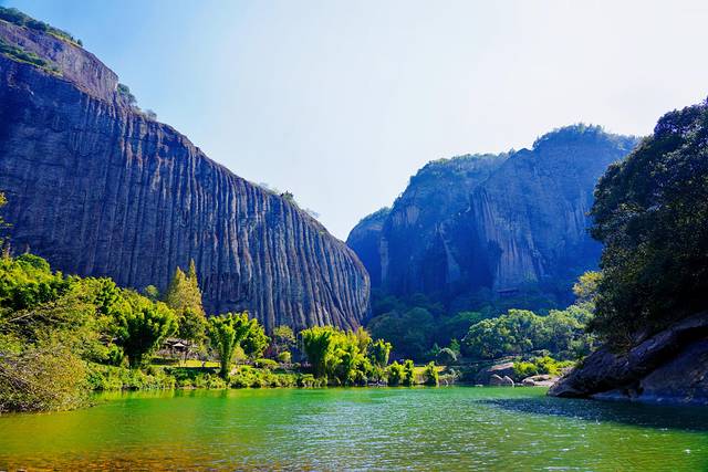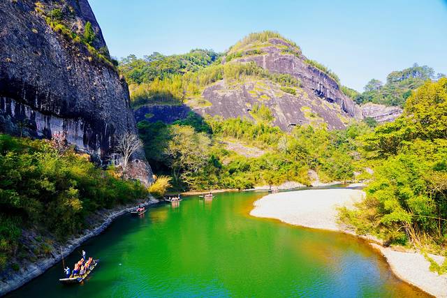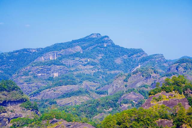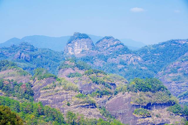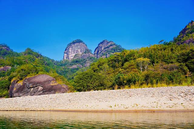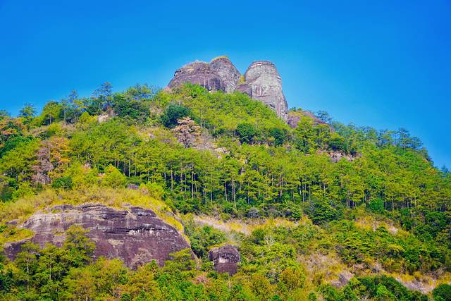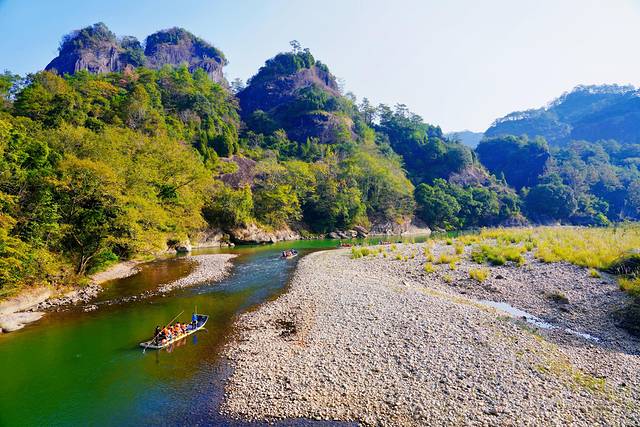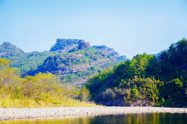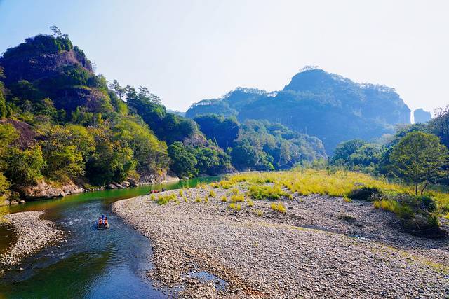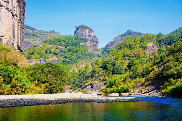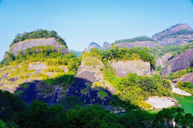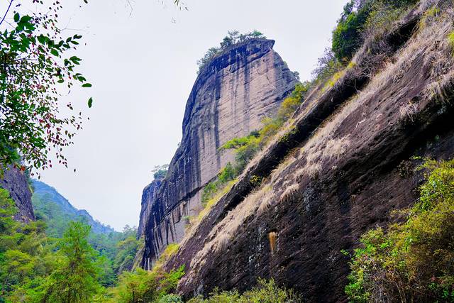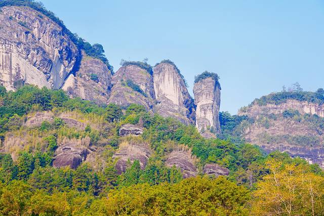 武夷山是典型的丹霞地貌,两侧奇峰耸立,怪石嶙峋。