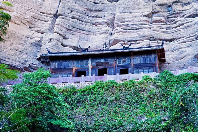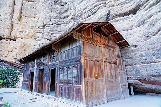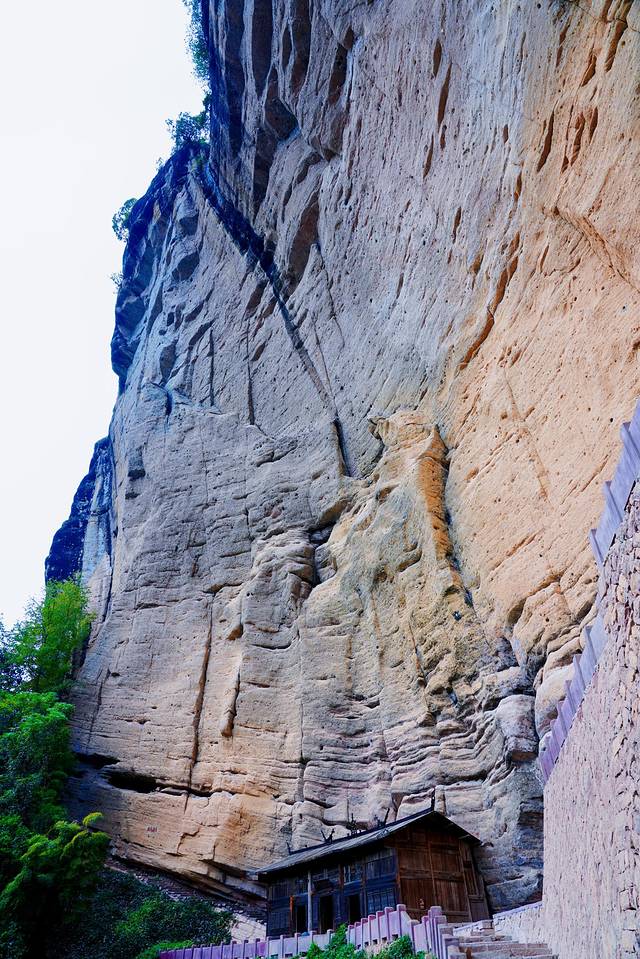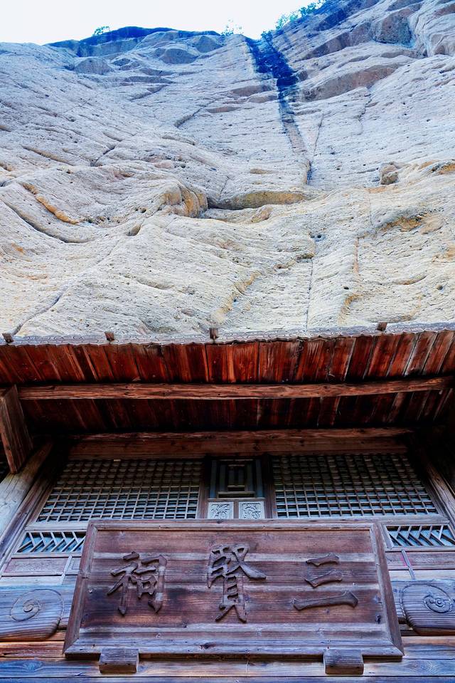 天成禅院建在虎啸岩的悬崖下,这里千仞悬崖向外斜覆,形成一个巨大的洞府,整座禅院不施片瓦,风雨不侵。