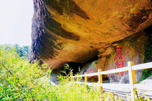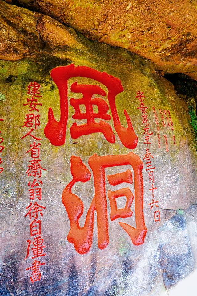 从伏羲洞进入一线天,沿石罅右行约数十步,就可以折入风洞。风洞是武夷山七十二名洞之一,为一线天景观的最高处。来到洞中,凉风从石罅中习习吹来,即使稍坐片刻,都会感到肌骨透凉。洞口石壁上的“风洞”二字,十分醒目,为宋徐自强所书。