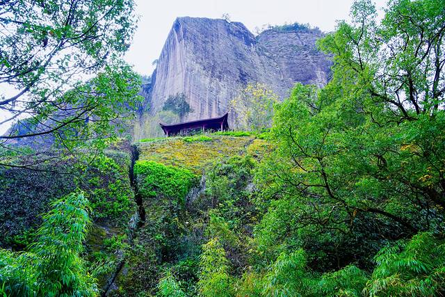 往前就是水月亭,亭子位于隐屏峰下,是武夷山中赏月的最佳之处,据说月明星稀的夜晚,在亭中喝酒赏月,可以见到四个月亮,即天上一个、水中一个、杯中一个,还有心中一个,如此意境,真令人向往!可惜我们无缘晚上过来,但即使是白天,水月亭的风光也足以称得上惊艳。值得推荐的是下图中水月亭左边的那条裂缝,这是小一线天,如果时间紧张,正宗的一线天景区没法去的话,在这里感受一下也是可以的。