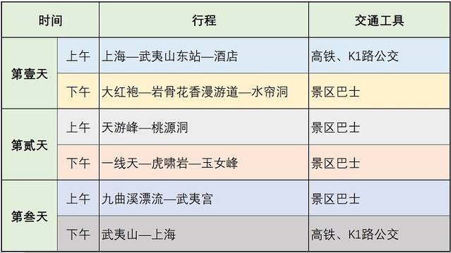 行程安排的思路如下:第一天上午从各地前往武夷山,因为舟车劳顿的关系,所以下午的半天时间可以考虑安排相对轻松的大红袍——水帘洞路线,晚上还可以前往环岛南路16号(印象大红袍剧场)观看由张艺谋、王潮歌、樊跃共同导演的《印象大红袍》演出;经过一晚上体力的恢复,元气满满的你可以利用第二天一整天的时间爬天游峰、探桃源洞、登虎啸岩、过一线天、赏玉女峰,当然这一天相对会累一些;经历了前一天的消耗,不妨将两个小时轻松惬意的竹筏漂流安排在第三天上午,这趟九曲溪之旅不仅会让你的体能值再次得到修复,更能为整个行程画上一个圆满的句号。这样松——紧——松的行程安排会在保证游玩尽兴的同时,不至于太累,非常适合亲子游。