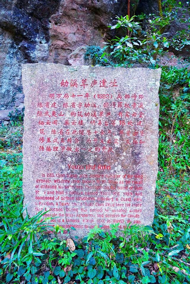 老虎洞路线经过的是上云窝,这里还是幼溪草庐遗址所在地。明朝万历十一年(1583年),兵部侍郎陈省(字幼溪)因得罪权贵退隐武夷山,在此构筑幼溪草庐,有宾云堂、栖云阁、巢云楼、研易台等16处建筑,上云窝巨石上的“云窝”二字即是陈省手书。陈省在此隐居十余年,并曾出资修葺武夷精舍,为开发云窝,发扬和传播理学做出了一定的贡献。