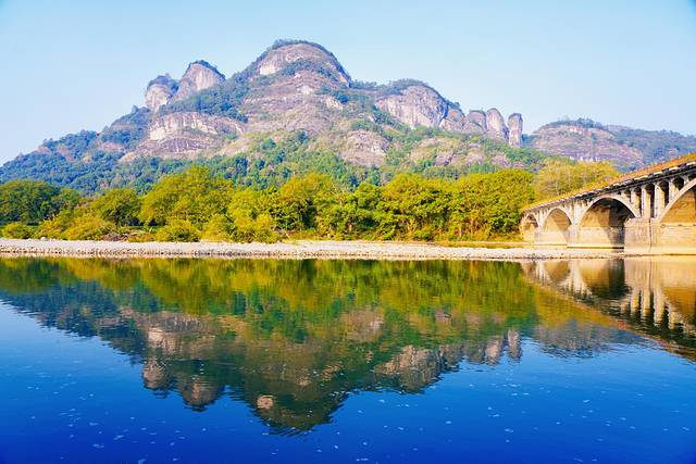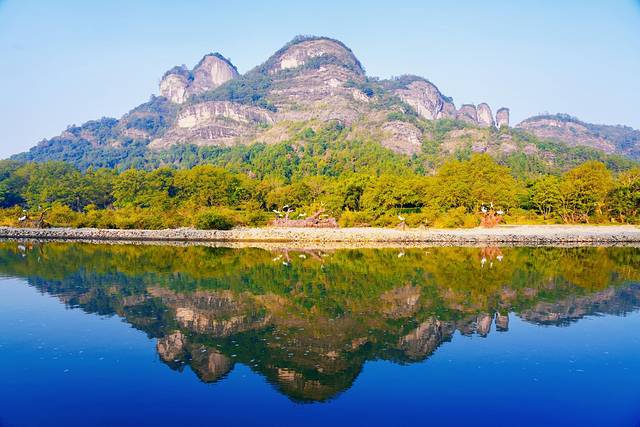 早晨的崇溪漫步道格外安静,一旁的崇阳溪水平如镜,水面上对岸山峰的倒影清晰可见。群峰最左边的两个山头是著名的大王峰,海拔530米,因山形如宦者纱帽,独具王者威仪而得名;中间的是幔亭峰,位于大王峰北侧,虽然山麓相连,但不如大王峰高,峰顶地势平坦,有一片巨石,状如香鼎,叫做宴仙坛,相传当年武夷君曾在此设幔亭宴会乡人,“幔亭”之名由此而来。
