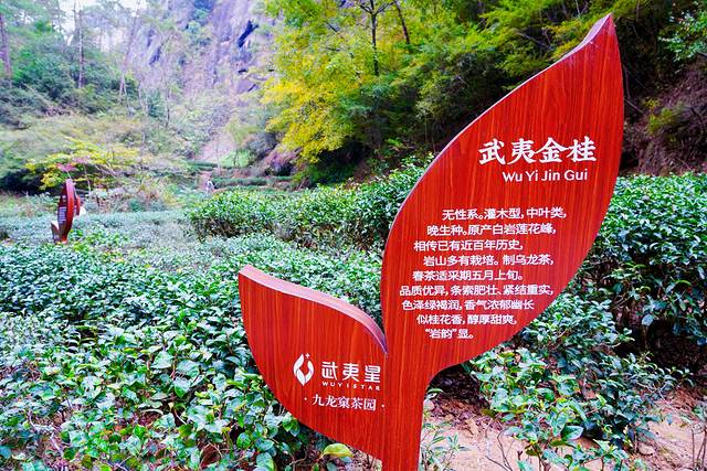 进入景区,两边的山南北对峙骈列,山间是名曰“九龙窠”的大峡谷,谷内曲径通幽,一条石板路延伸至峡谷深处,路的一旁是茶园,里面种植着不同品种的茶树,主要有玉桂、金桂等。